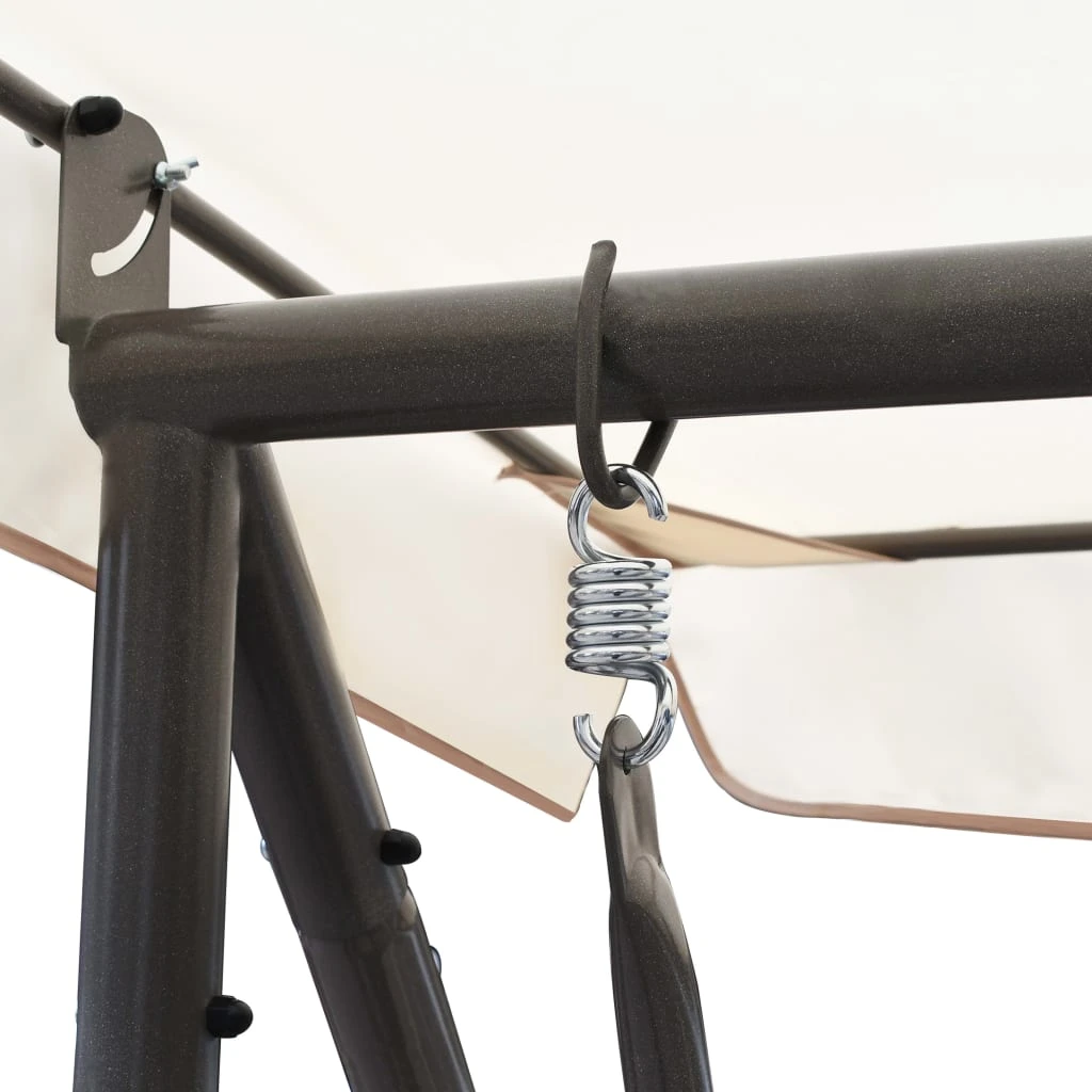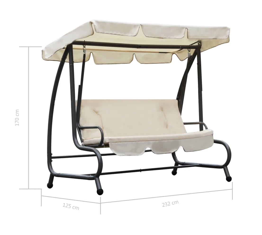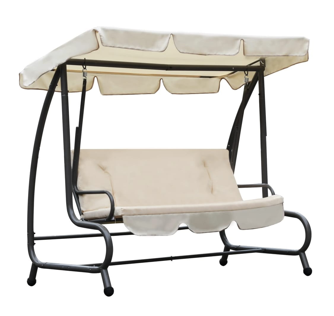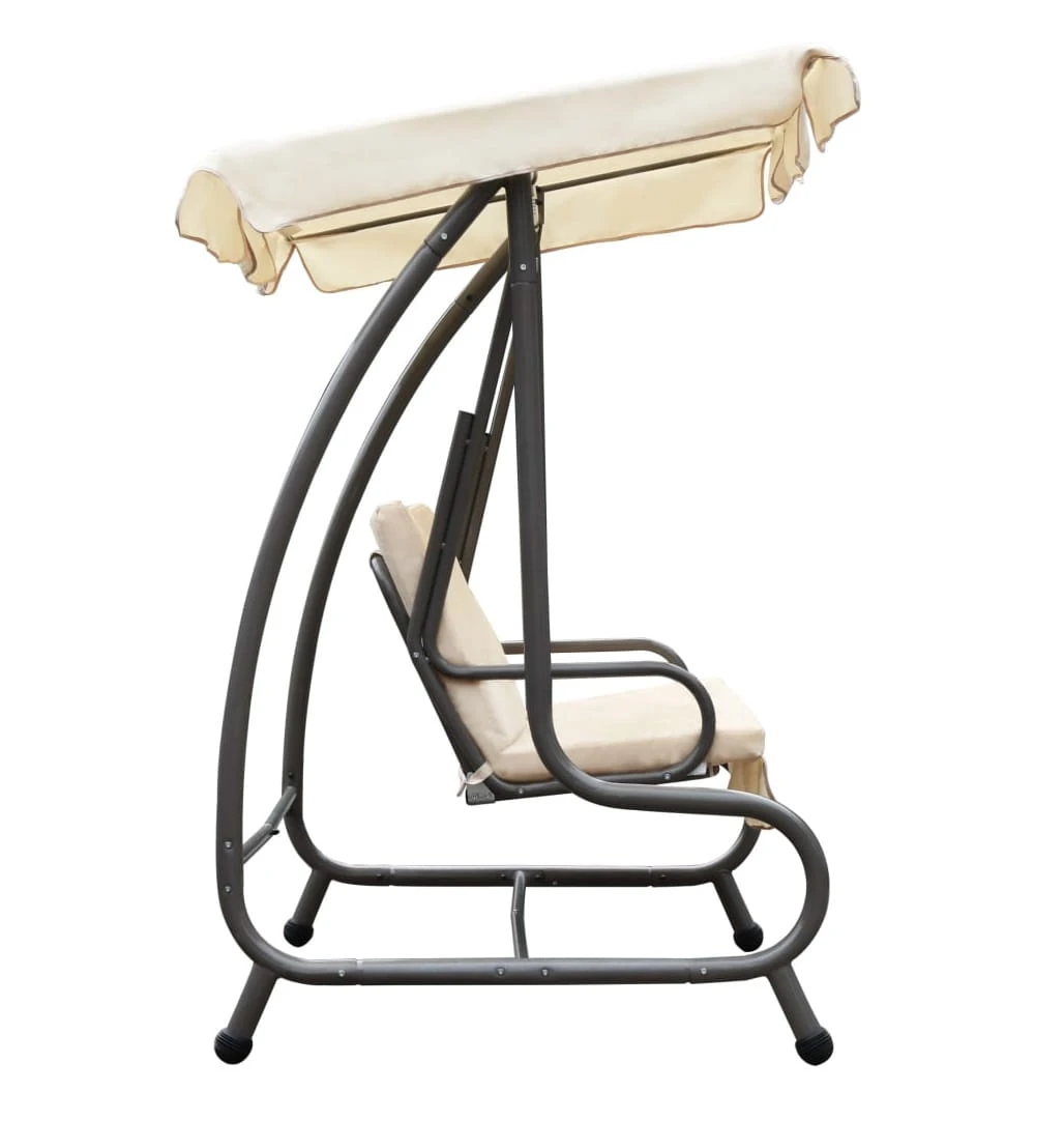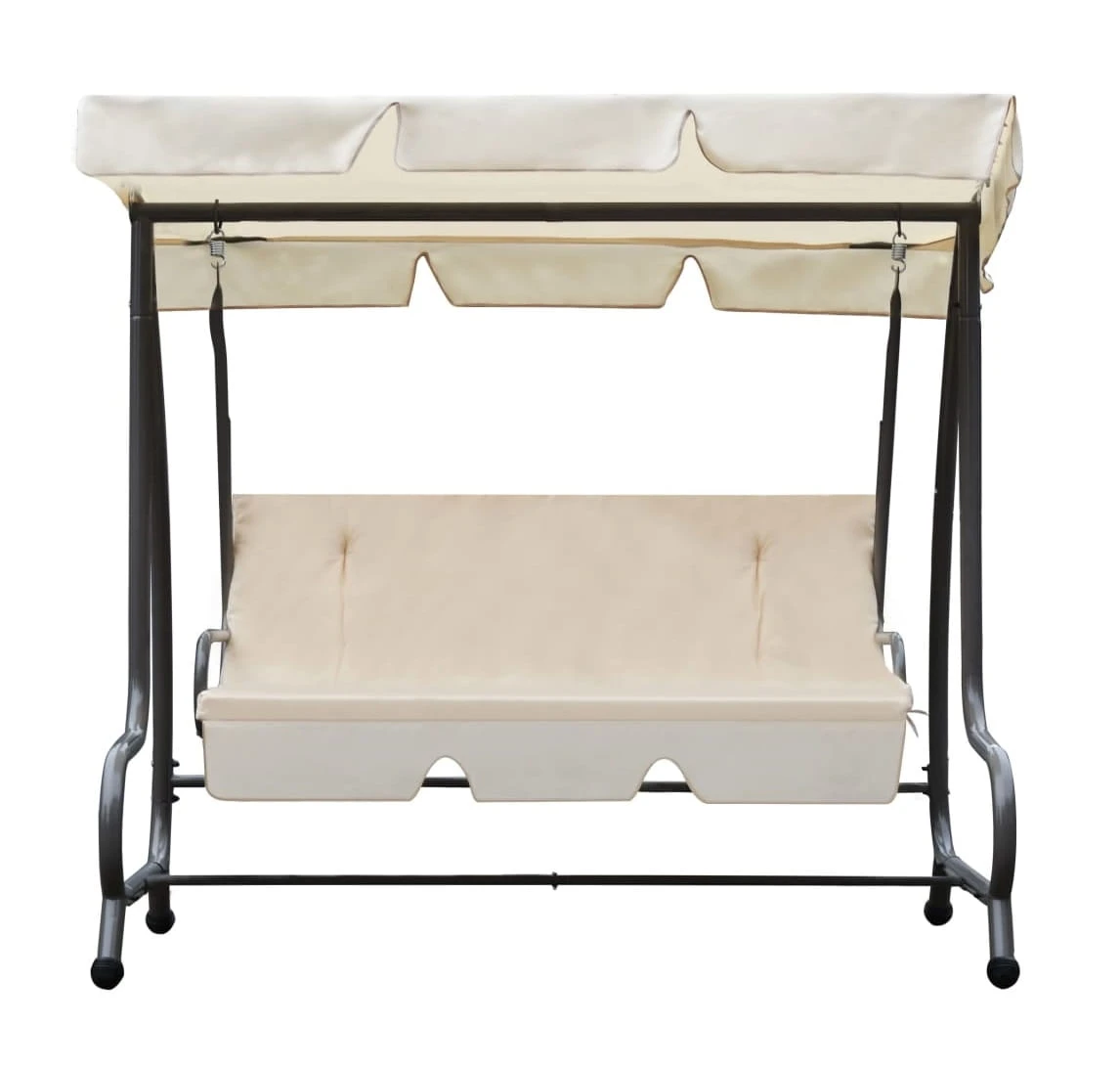 Huśtawka ogrodowa z baldachimem Frago opiera się na stalowej konstrukcji, dzięki czemu jest solidna i trwała. Stelaż ma ciemny kolor uzyskany efektem malowania proszkowego. Elementy te odporne są na niekorzystne działanie deszczu i słońca. Wygodne siedzisko, a także baldachim wyróżniają się subtelnym, kremowym kolorem, dzięki czemu huśtawka do ogrodu Frago idealnie wpisuje się w naturalne otocznie, w którym dominują tzw. kolory ziemi. Jest idealna do ogrodu i na działkę, ale sprawdzi się też na taras, szczególnie jeśli ten jest obszerny.