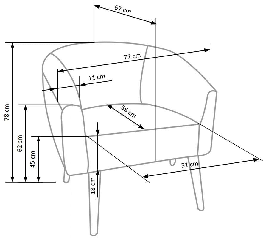 - Wymiary: szerokość - 77 cm, głębokość - 67 cm, wysokość całkowita - 78 cm, wysokość siedziska - 45 cm