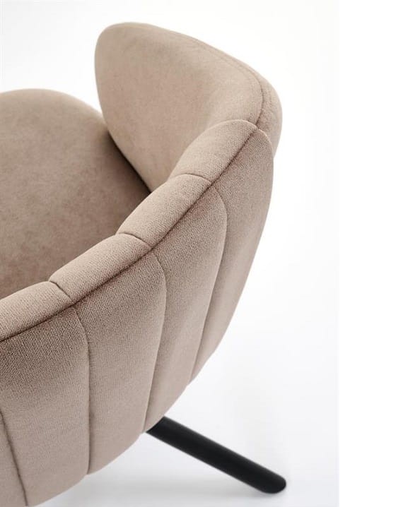 Kubełkowe siedzisko krzesła Karno zostało zaprojektowane z myślą o idealnym podparciu kręgosłupa. Zintegrowane z oparciem podłokietniki zapewniają dodatkowe wsparcie dla ramion, co jest szczególnie doceniane podczas długich spotkań przy stole. Innowacyjny mechanizm obrotowy pozwala na swobodne sięganie po przedmioty bez konieczności odsuwania krzesła, co znacząco zwiększa komfort użytkowania. Stabilna konstrukcja krzesła opiera się na czterech charakterystycznych nogach o owalnym profilu, wykonanych z metalu malowanego proszkowo na głęboki czarny kolor. Geometryczna forma stelaża, rozchodząca się harmonijnie od środka ku zewnątrz, nadaje meblowi lekkości, jednocześnie gwarantując doskonałą stabilność.