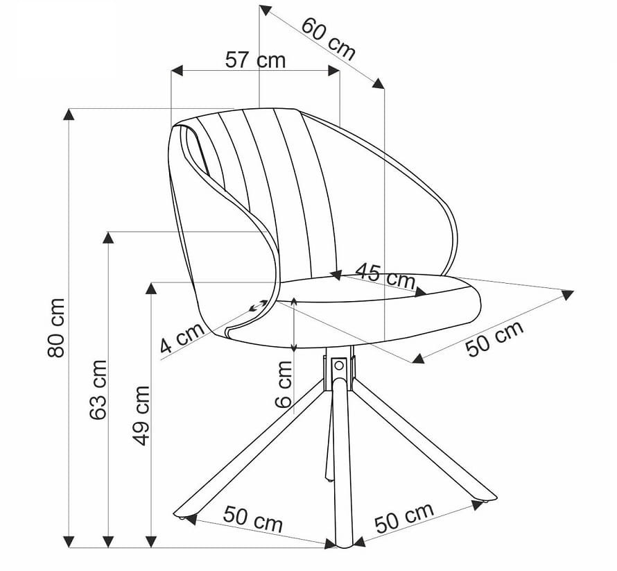- Wymiary: szerokość - 57 cm, głębokość - 60 cm, wysokość całkowita - 80 cm, wysokość od podłoża do siedziska - 49 cm