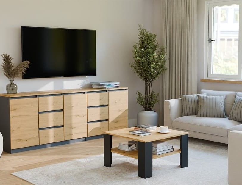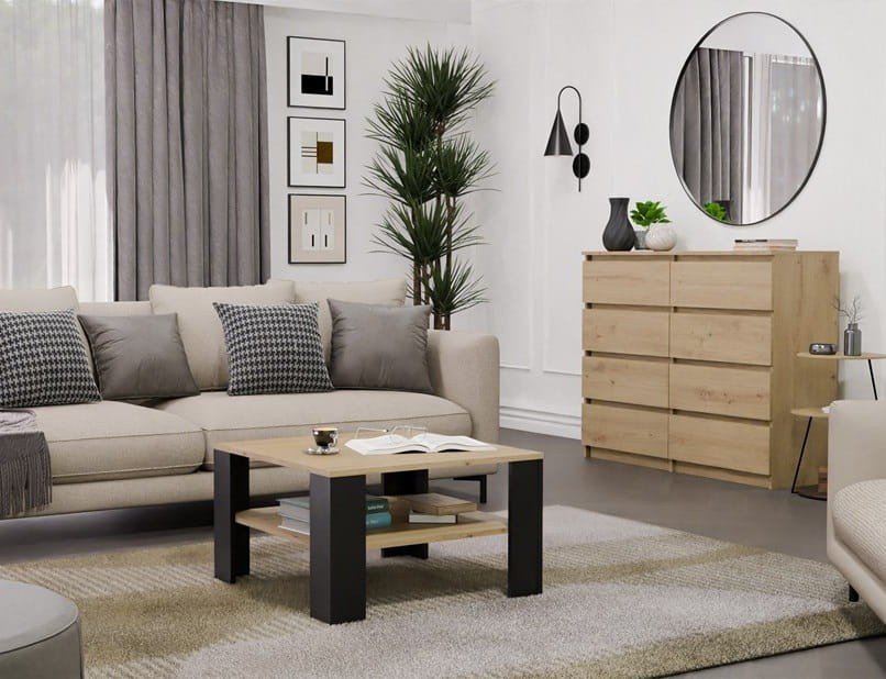 Duży stolik kawowy kwadrat wyróżnia się prostą, ponadczasową formą, która bez trudu wpisuje się w różne style aranżacyjne - od nowoczesnych i minimalistycznych, przez skandynawskie, aż po bardziej klasyczne wnętrza. Dzięki temu nie musisz obawiać się, że mebel szybko przestanie pasować do zmieniającej się koncepcji wystroju. Ława wykonana jest z płyty laminowanej o podwyższonej twardości, co przekłada się na większą odporność powierzchni na zarysowania i codzienne użytkowanie. To szczególnie istotne w salonie, który jest intensywnie eksploatowany, a meble muszą sprostać zarówno spotkaniom towarzyskim, jak i spokojnym wieczorom z rodziną. Wybierając ławę Qube, inwestujesz w trwałość, estetykę i komfort użytkowania, które realnie wpływają na jakość codziennego życia. Jeśli zależy Ci na meblu, który łączy funkcjonalność dużej ławy do salonu z elegancją kwadratowego stolika kawowego, a przy tym odpowiada na potrzeby nowoczesnych wnętrz, ława Qube będzie świadomym i praktycznym wyborem.