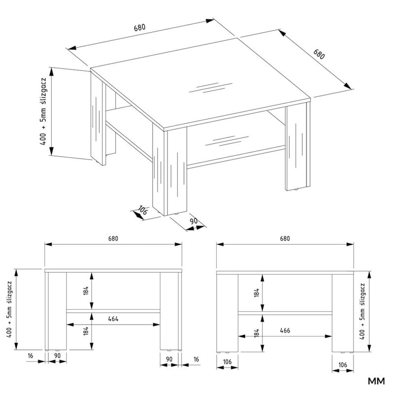- Wymiary: szerokość - 68 cm, długość - 68 cm, wysokość - 40 cm, odległość od półki do blatu - 18,4 cm