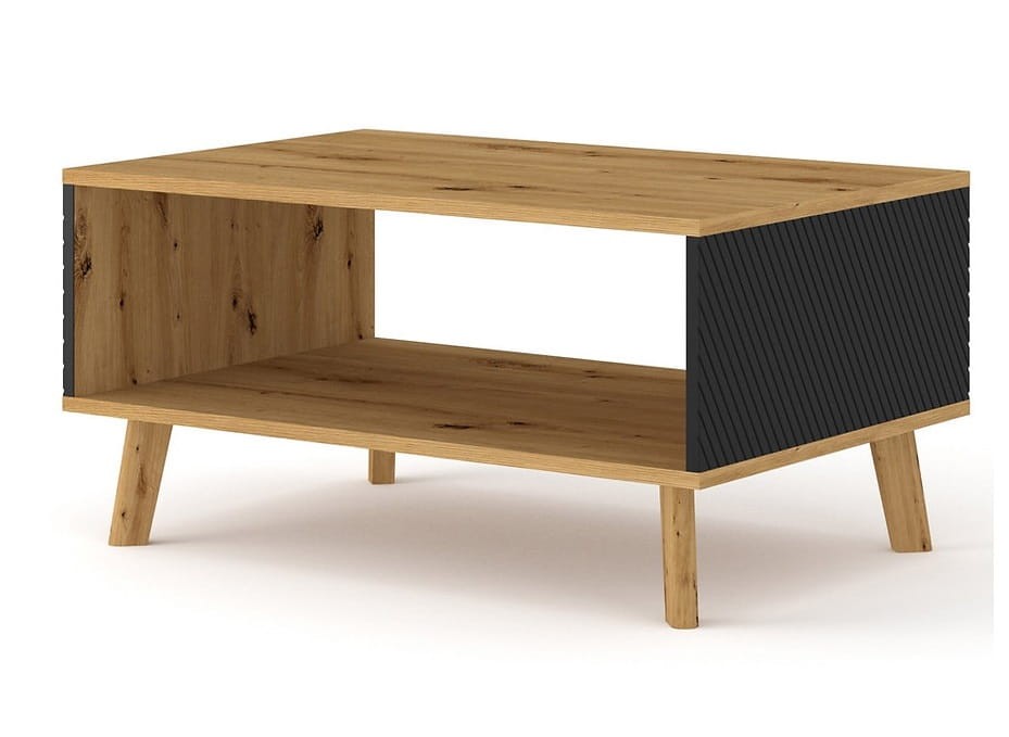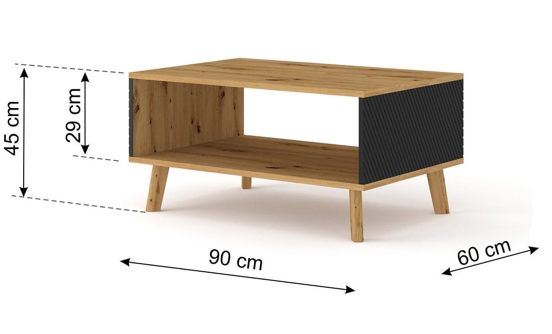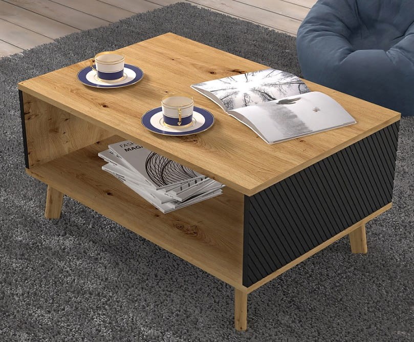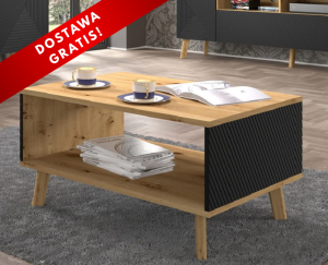 Stolik ten będzie wspaniale prezentować się w pomieszczeniach urządzonych w nurcie industrialnym, a to za sprawą dostrzegalnego lecz subtelnego połączenia tradycji z nowoczesnością. Do nurtu retro z pewnością nawiązuje interesujące wybarwienie ławy do salonu w pięknym kolorze dębu artisan. Swoiste przełamanie stanową tu jednak modne wstawki w matowej czerni, z ryflowaniami, jak również niezwykle minimalistyczna konstrukcja.