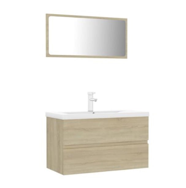 Oferowany stylowy zestaw mebli łazienkowych Neil składa się z szafki wiszącej, wbudowanej w nią umywalki i lustra. Dzięki uniwersalnemu stylowi i kolorystyce elementy te doskonale pasować będą do Twojej łazienki lub toalety. Szafka i oprawa lustra wykonane zostały z płyty meblowej w uniwersalnym kolorze dąb sonoma. Jest to jeden z najbardziej popularnych odcieni drewna meblowego, dlatego z pewnością nasz zestaw mebli łazienkowych konweniować będzie z każdą aranżacją.