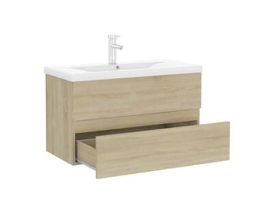 Wisząca szafka pod umywalkę, która jest najważniejszym elementem naszego zestawu, wykonana została z płyty laminowanej w kolorze dąb sonoma. Szafka posiada jedną, ale za to obszerną szufladę wyposażoną w nowoczesną prowadnicę. Szuflada umożliwia przechowywanie kosmetyków i środków do pielęgnacji ciała, dzięki czemu znajdować się będą zawsze pod ręką.