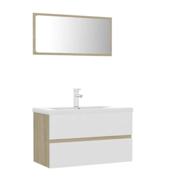 Oferowany stylowy zestaw mebli łazienkowych Neil składa się z szafki wiszącej, wbudowanej w nią umywalki i lustra. Dzięki uniwersalnemu stylowi i kolorystyce elementy te doskonale pasować będą do Twojej łazienki lub toalety. Szafka i oprawa lustra wykonane zostały z płyty meblowej w uniwersalnym kolorze dąb sonoma z elementami pokrytymi okleiną w kolorze białym. Połączenie bieli i jednego z najbardziej popularnych gatunków drewna meblowego gwarantuje, że nasz zestaw mebli łazienkowych konweniować będzie z każdą aranżacją.