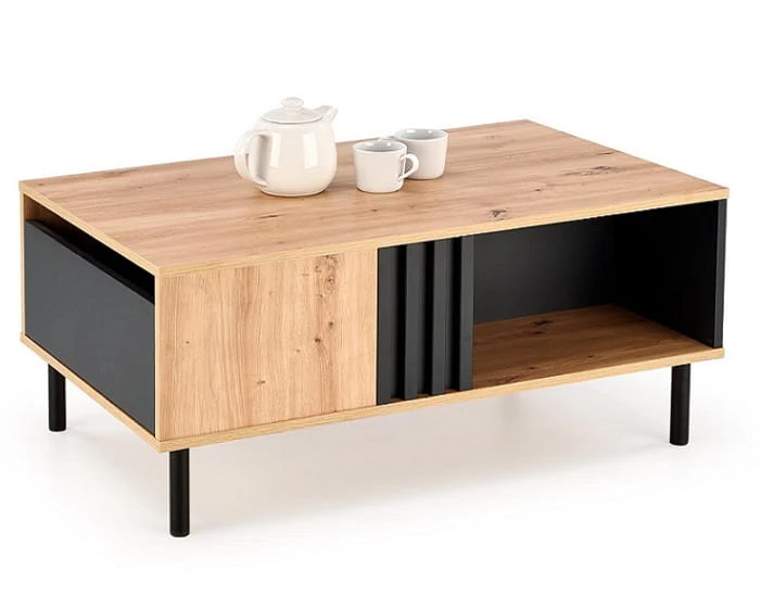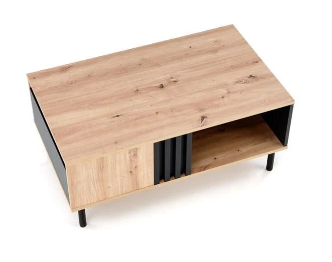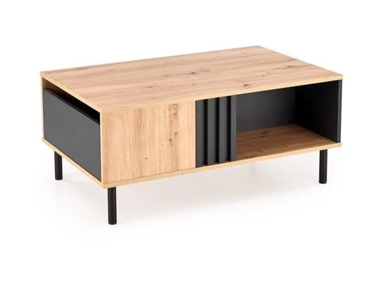 Prostokątny blat w ciepłym odcieniu dębu artisan o optymalnych wymiarach 100x60 cm zapewnia komfortową przestrzeń użytkową, idealną do serwowania przekąsek podczas spotkań towarzyskich czy relaksu przy ulubionej lekturze. Jednak prawdziwy potencjał tej ławy kryje się pod jej powierzchnią – przemyślany system przechowywania łączy w sobie pojemną półkę oraz praktyczną szufladę, doskonałą do organizacji niezbędnych drobiazgów, takich jak piloty czy czasopisma. Charakterystycznym elementem designu są czarne wstawki między górnym a dolnym blatem, które tworzą efekt modnych lameli, nadając meblowi nowoczesny, industrialny charakter. To nietuzinkowe rozwiązanie sprawia, że ława Sonia wyróżnia się na tle podobnych mebli, jednocześnie zachowując elegancką prostotę typową dla stylu loft.