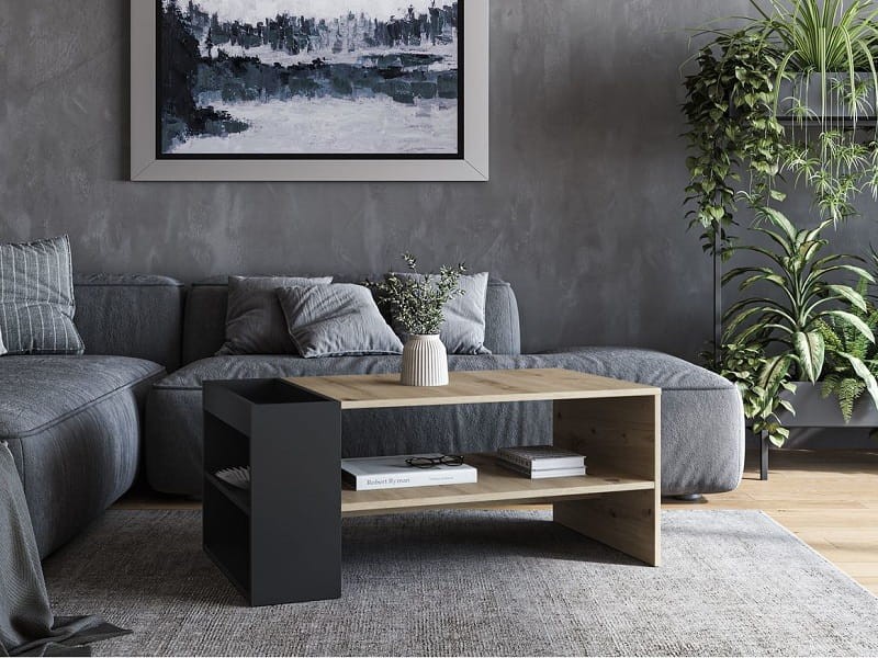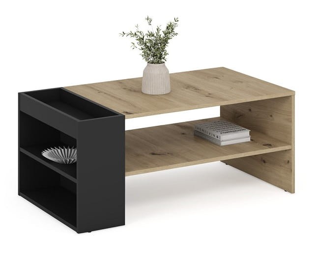 Dwukolorowe wykończenie ławy kawowej dodaje charakteru i nowoczesności, a jednocześnie sprawia, że mebel pasuje do różnorodnych aranżacji. Połączenie ciepłego odcienia drewna - dąb artisan - z eleganckimi czarnymi elementami nadaje wnętrzu stylowy, a zarazem przytulny charakter.