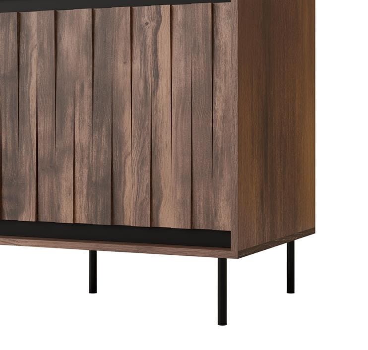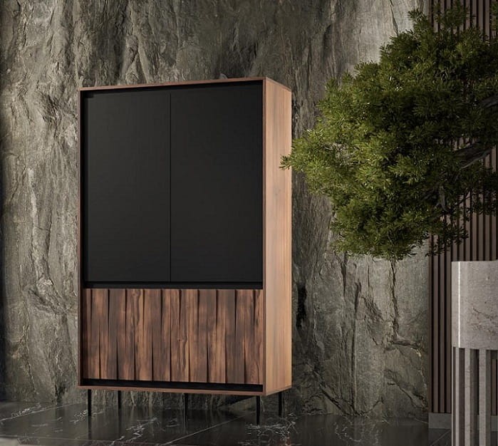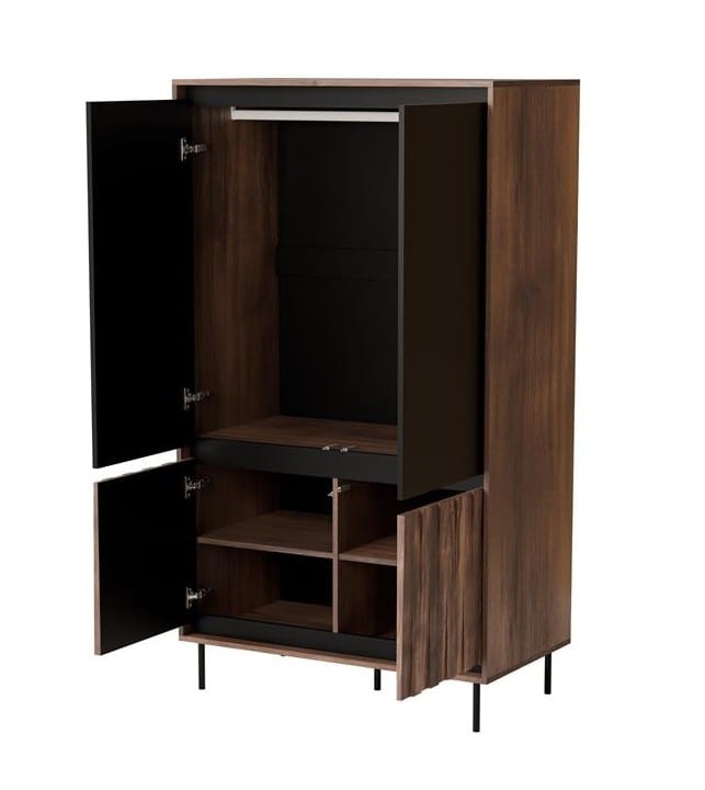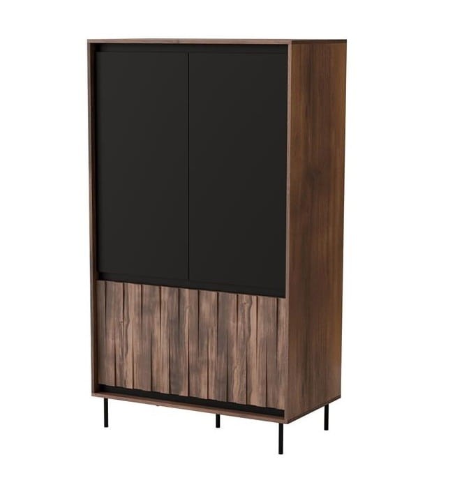 Dzięki dwóm rodzajom frontów - czarnym na górze i orzechowym na dole - który dodatkowo imituje deski, nasza szafa staje się nie tylko praktycznym meblem, ale także niepowtarzalną ozdobą przestrzeni. Idealnie pasuje do eleganckich wnętrz urządzonych w stylu industrialnym, dodając im niepowtarzalnego charakteru i wyjątkowego uroku.