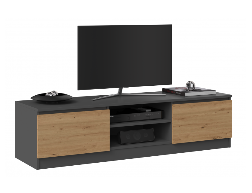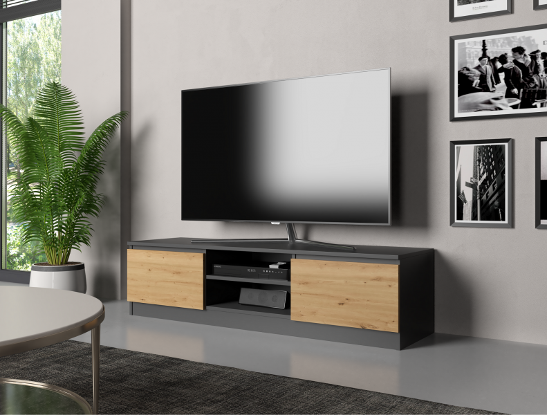 Prezentowana szafka pod telewizor i na sprzęty multimedialne cechuje się optymalnymi wymiarami. Długa na 140 cm i szeroka na 40 cm - doskonale wpisze się w przestrzeń przeznaczoną do codziennej rozrywki i wypoczynku domowników. Można zawiesić nad nią odbiornik TV lub ustawić go bezpośrednio na niej.