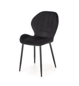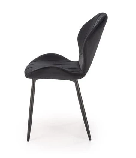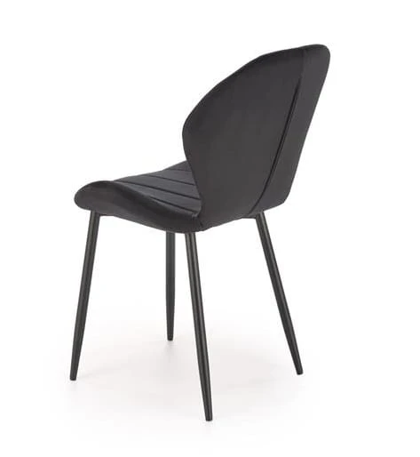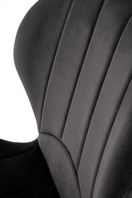 Tapicerka wykonana z luksusowej tkaniny velvet w głębokiej czerni podkreśla nowoczesny i elegancki styl tego modelu. Aksamitny materiał dodaje krzesłu wyjątkowego szyku, a jednocześnie jest miły w dotyku, co zwiększa przyjemność użytkowania. Pionowe przeszycia na oparciu i siedzisku wprowadzają subtelny geometryczny akcent, który harmonijnie uzupełnia prostą i efektowną formę mebla.