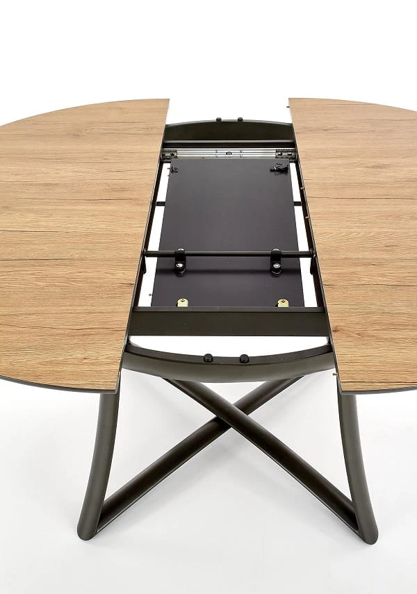 Oryginalny stół Ofion to model, w którym designerski zamysł osiągnął wyżyny kreatywności. Cechuje go prostota, a zarazem niebanalny charakter. Interesujący, gięty, metalowy stelaż, przełamujący konwencje sztuki meblarskiej – wzbogacono tu o piękny i solidny blat! Ma on średnicę aż 118 cm i jest w ciepłym, drewnianym odcieniu złotego dębu! Okrągły blat stołu wykonany jest z wysokiej jakości płyty laminowanej i z pewnością wyróżnia się klasą. W połączeniu ze stalowym stelażem – przełamuje wszelkie konwencje. Dlatego stół do jadalni Ofion 118×118 to wyjątkowo praktyczny, innowacyjny i efektowny mebel! Idealny dla osób, które kochają wielkomiejski lifestyle. Dodatkowo stół posiada wkładkę lakierowaną na kolor popiel, dzięki której można rozłożyć go do rozmiaru 148 cm.
