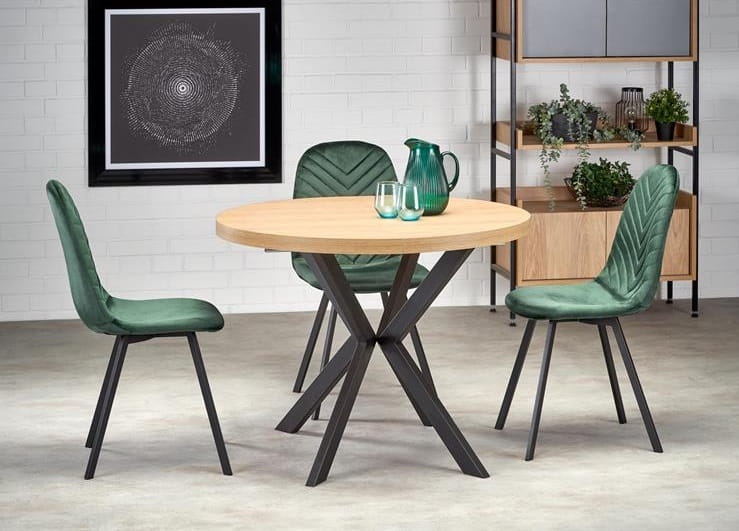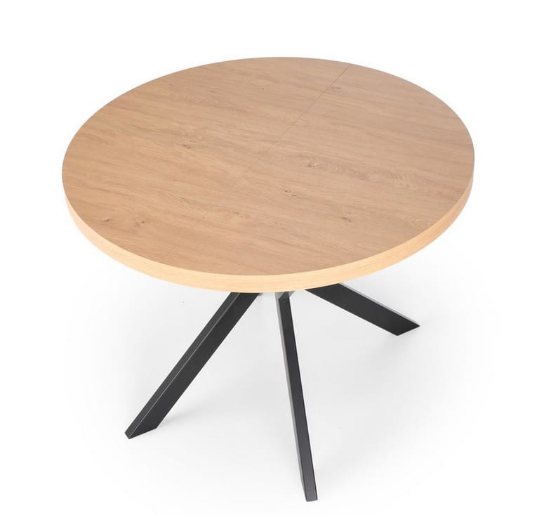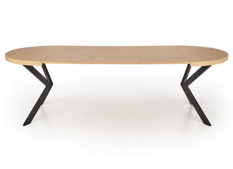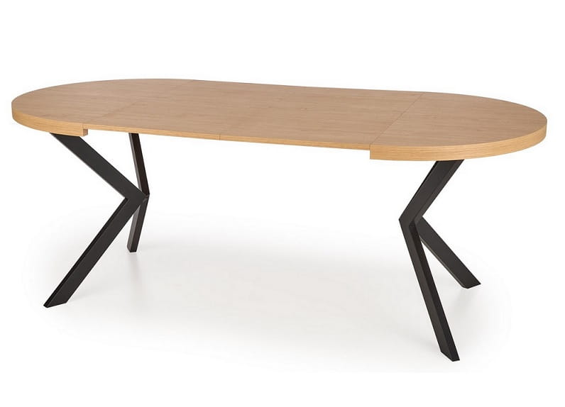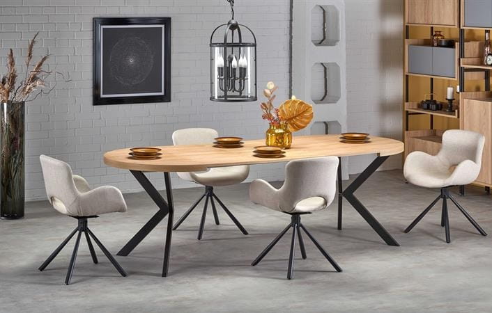 Jego unikalny design to inspirujące połączenie czarnych, metalowych nóg w interesującej formie ze stylowym blatem wykonanym z płyty meblowej w odcieniu ciepłego drewna - dąb zloty. Takie zestawienie nadaje temu stołowi niepowtarzalnego, eleganckiego charakteru, doskonale wpisując model w nurty współczesnego wzornictwa.