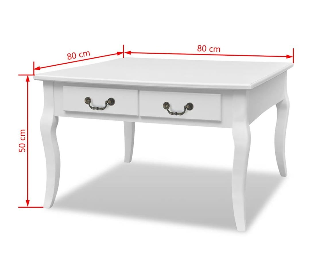 Prezentowany stolik odstawczy ma regularny, kwadratowy kształt (80 cm x 80 cm) i wyposażony jest aż w cztery szuflady, znajdujące się pod blatem. Dzięki temu zapewnia też sporo dodatkowego miejsca do przechowywania.