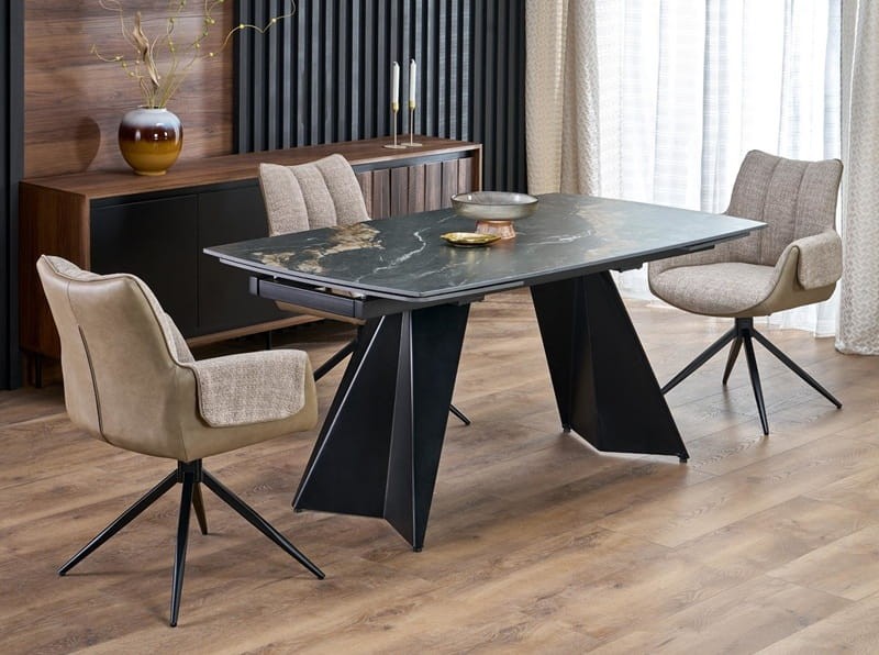 Jeśli marzysz o jadalni, która wygląda jak z kartki magazynu wnętrzarskiego, warto połączyć stół Armani z krzesłami w czarnej tapicerce lub ze stalowymi nogami, które podkreślą nowoczesny, elegancki charakter całej kompozycji. W naszej ofercie znajdziesz krzesła tapicerowane w głębokich czerni, szarościach czy ciemnych granatach, które dodadzą stołowi miękkości i komfortu, a jednocześnie zachowają wizualną spójność z metalowymi nogami. Możesz również postawić na fotele z podłokietnikami, które wprowadzą do przestrzeni dodatkową wygodę i sprawią, że dłuższe posiłki czy spotkania biznesowe staną się przyjemnością.