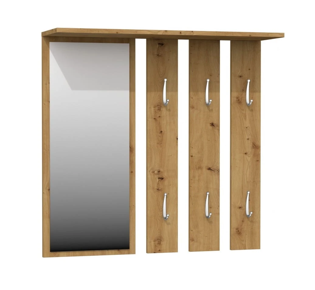 Solidny wieszak ścienny z lustrem to mebel iście kluczowy! Haczyki na ubrania służą temu, by odwiesić nań kurtkę, płaszcz, palto czy bluzę. Z kolei specjalna, panelowa konstrukcja ma walory dekoracyjne. Płyta laminowana z jakiej wykonany jest wieszak - jest odporna i wytrzymała, podobnie jak obrzeża wykończone tworzywem PCV. Nasz stylowy zestaw sprawdzi się w domach, mieszkaniach i poczekalniach do wszelkiego rodzaju gabinetów.