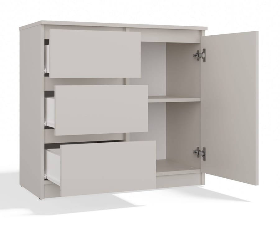 Subtelny odcień kaszmiru sprawia, że ta szafka biurowa stanie się harmonijnym elementem praktycznie każdego pomieszczenia. Niezależnie od tego, czy urządzasz przestrzeń w stylu skandynawskim, minimalistycznym, czy preferujesz bardziej klasyczne rozwiązania, ten kolor doskonale wpisuje się w różnorodne aranżacje, tworząc spokojną, ale jednocześnie wyrafinowaną atmosferę. Komoda sprawdzi się równie dobrze w sypialni jako miejsce na bieliznę i akcesoria, w salonie jako stylowy element przechowywania, jak i w biurze domowym, gdzie pomoże utrzymać porządek wśród dokumentów i materiałów biurowych.