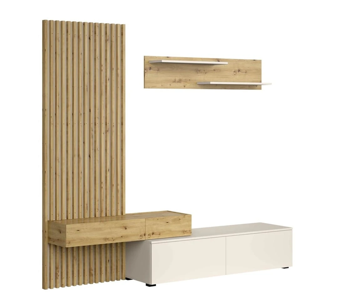 Panel lamelowy to prawdziwe serce tego zestawu, element który wprowadza do wnętrza głębię i rytm, jednocześnie optycznie powiększając przestrzeń dzięki pionowym liniom. Jeśli szukasz meblościanki do małego salonu, która nie przytłoczy pomieszczenia, ale wręcz przeciwnie - doda mu lekkości i naturalnego uroku, zestaw Camis jest idealnym wyborem. Lamele tworzą wyrafinowane tło dla pozostałych elementów, a ich ciepła tekstura w kolorze dębu artisan wypełnia wnętrze przytulnością i harmonią, doskonale komponując się z delikatnym kaszmirowym odcieniem szafki.