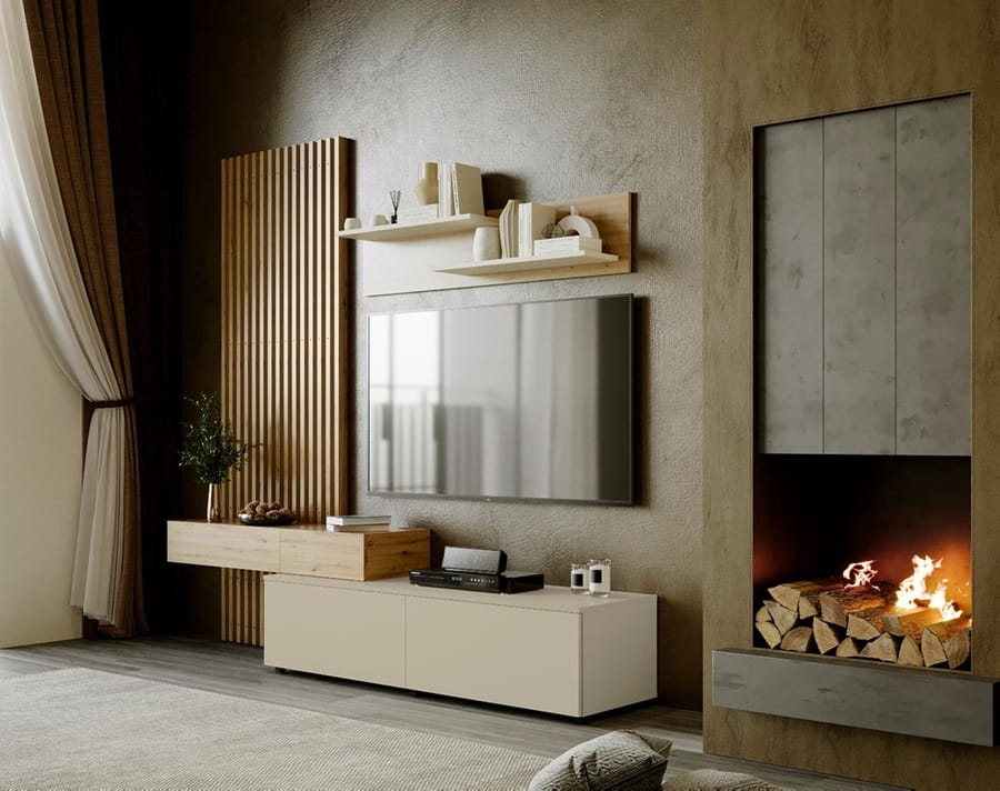 Komplet mebli Camis to przemyślana kompozycja trzech elementów, które wspólnie tworzą spójną i harmonijną całość. W skład zestawu wchodzi szafka RTV z oryginalną nadstawką, wisząca półka oraz efektowny panel ścienny imitujący drewniane lamele, który od razu przyciąga wzrok i nadaje wnętrzu ciepłego charakteru. To połączenie sprawia, że meble z szafką RTV kaszmir stają się nie tylko praktycznym centrum multimedialnym, ale również designerskim akcentem, wokół którego można zbudować całą aranżację salonu wypełnionego spokojem i naturalnym pięknem.
