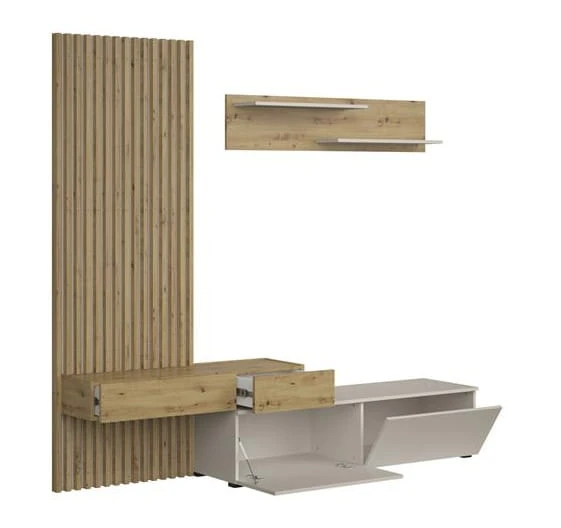 Kompakt nie musi oznaczać kompromisu - zestaw Camis to dowód na to, że nawet w niewielkim salonie można stworzyć pełnowartościową strefę wypoczynku i rozrywki, która będzie zarówno praktyczna, jak i estetyczna. Przemyślana konstrukcja tego zestawu pozwala wykorzystać przestrzeń pionową, co jest kluczowe w małych wnętrzach, gdzie każdy metr kwadratowy ma znaczenie. Panel lamelowy i wisząca półka kierują wzrok w górę, optycznie podwyższając pomieszczenie, podczas gdy szafka RTV pozostaje niewielka i nie dominuje przestrzeni, a jej jasny kolor dodatkowo rozświetla wnętrze. To nowoczesna meblościanka, która rozumie wyzwania współczesnego mieszkania – ograniczoną przestrzeń, potrzebę przechowywania wielu przedmiotów i pragnienie życia w pięknym, uporządkowanym wnętrzu przepełnionym światłem i spokojem. Camis odpowiada na wszystkie te potrzeby jednocześnie, oferując rozwiązanie kompletne, które nie wymaga od Ciebie szukania i dopasowywania kolejnych elementów wyposażenia. Wszystko, czego potrzebujesz do funkcjonalnej strefy telewizyjnej, jest już tutaj, przemyślane i gotowe do użycia.