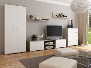 W skład meblościanki Carles wchodzi: szafa, szafka rtv, komoda oraz 2 półki wiszące. Wszystkie szafki zostały wykonane z płyty laminowanej o grubości 18 mm, ścianą tylną zestawu jest płyta HDF. Jest to produkt polski, wykonany z dbałością o każdy szczegół, dlatego też posłuży Ci przez długie lata.