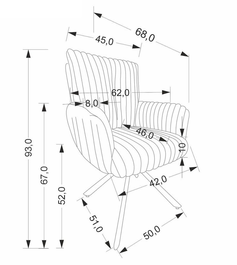 - Wymiary: szerokość - 62 cm, głębokość - 68 cm, wysokość - 93 cm, wysokość siedziska - 52 cm