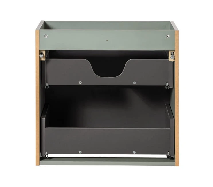 Szafka wyróżnia się precyzyjnie wykonanymi, pionowymi ryflami na frontach szuflad, które nie tylko stanowią wspaniały element dekoracyjny, ale także podkreślają kunszt wykonania. Eleganckie, srebrne uchwyty doskonale współgrają z pastelową kolorystyką, tworząc spójną całość o minimalistycznym charakterze. Dwie pojemne szuflady zapewniają przestrzeń na wszystkie niezbędne akcesoria łazienkowe, kosmetyki oraz ręczniki, pomagając utrzymać nienaganny porządek. Kompaktowe wymiary szafki - 60 cm szerokości i 40 cm głębokości - sprawiają, że doskonale sprawdzi się zarówno w przestronnych, jak i bardziej kameralnych łazienkach. Konstrukcja mebla została przystosowana do montażu umywalki nadblatowej, co pozwala na maksymalne wykorzystanie przestrzeni przechowywania. Blat wykonany w tym samym miętowym odcieniu co fronty tworzy spójną, harmonijną kompozycję.