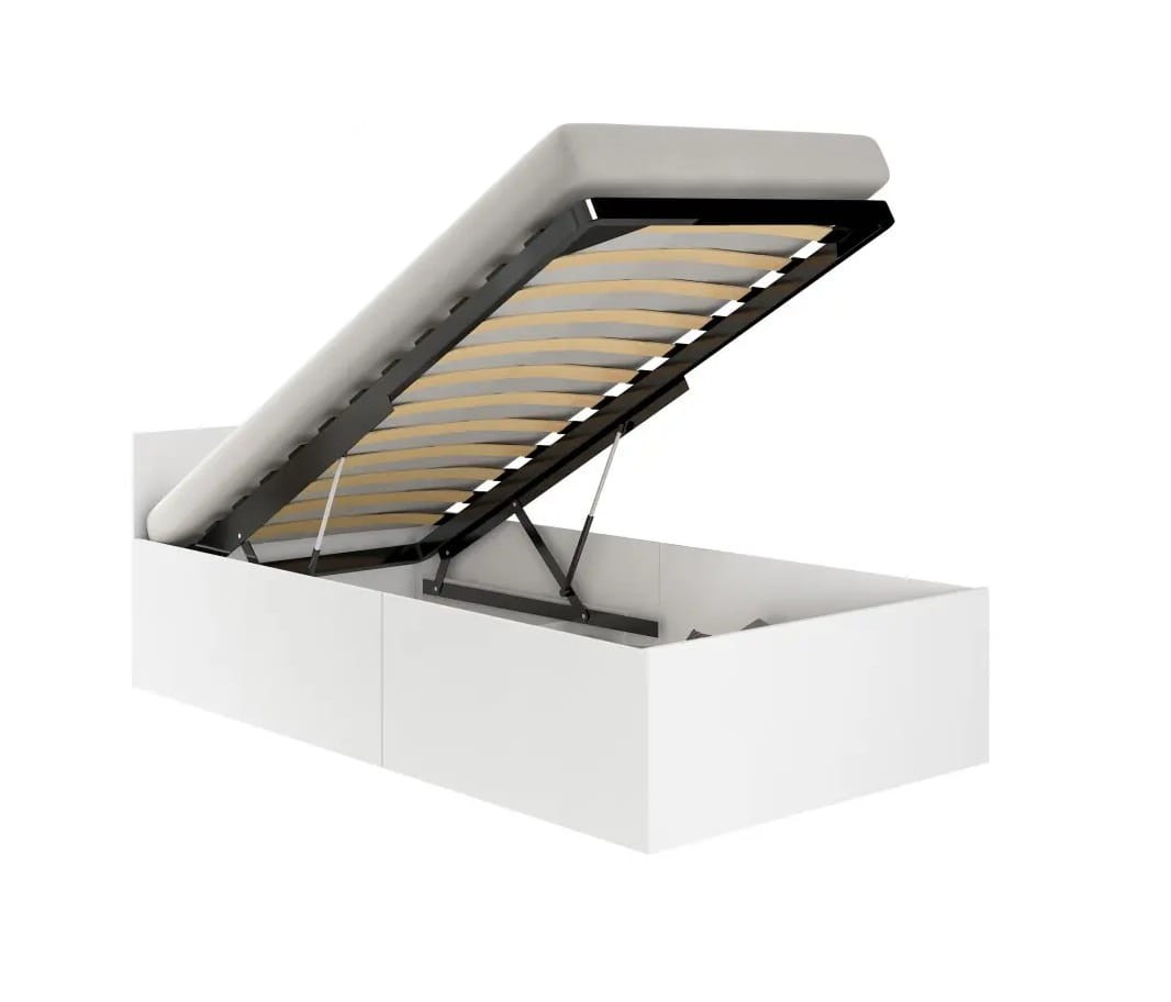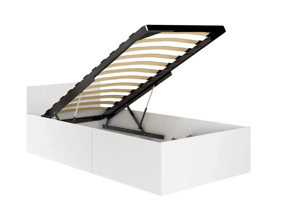 Łóżko jednoosobowe Amato stworzone zostało jako wyposażenie niewielkiej sypialni lub pokoju młodzieżowego. To stabilny i wytrzymały mebel wykonany z wysokiej jakości płyty meblowej, zaopatrzony w podnoszony stelaż z płaskich, odpowiednio uformowanych brzozowych listew. Łóżko jednoosobowe Amato posiada również obszerny, funkcjonalny pojemnik na pościel, który sprzyja dobremu zagospodarowaniu przestrzeni w pomieszczeniu. Dzięki niemu mebel będzie służyć nie tylko do spania, ale też jako miejsce na przechowywanie poduszek, kołdry czy ciepłych koców. Wystarczy unieść drewniany stelaż, co dzięki sprawnie działającym gazowym siłownikom zrobimy dosłownie jedną ręką, by mieścić zbędne rzeczy.