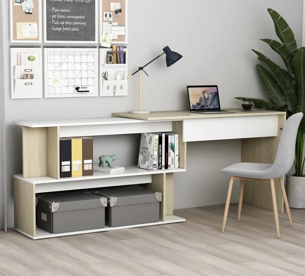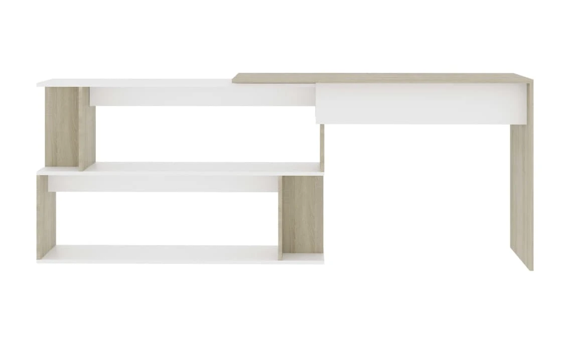 Piękne biurko narożne w kolorze dąb sonoma z białym to doskonała propozycja dla osób o wysokich oczekiwaniach co do mebla przeznaczonego do pracy umysłowej lub do nauki. Prezentowane biurko jest eleganckie, a zarazem funkcjonalne. Piękny design z pewnością uprzyjemni wykonywanie codziennych zadań kancelaryjnych oraz informatycznych.