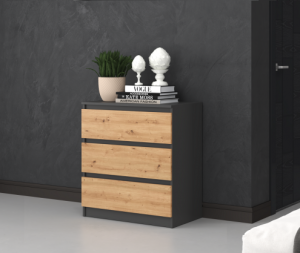 Komoda posiada trzy pojemne szuflady, w których pomieszczą się nie tylko ubrania, ale także wiele innych przydatnych drobiazgów.Fronty szuflad bez uchwytów zapewniają wygodne użytkowanie i podkreślą modernistyczny charakter wnętrza. Szuflady poruszające się na niezawodnych prowadnicach sprawiają, że korzystanie z mebla jest czystą przyjemnością. Jeżeli dodamy do tego fakt, że do jego czyszczenia wystarczy wilgotna szmatka, tworzy się obraz mebla, który służyć nam będzie bardzo długo bez uszczerbku na jego funkcjonalnych i estetycznych walorach.