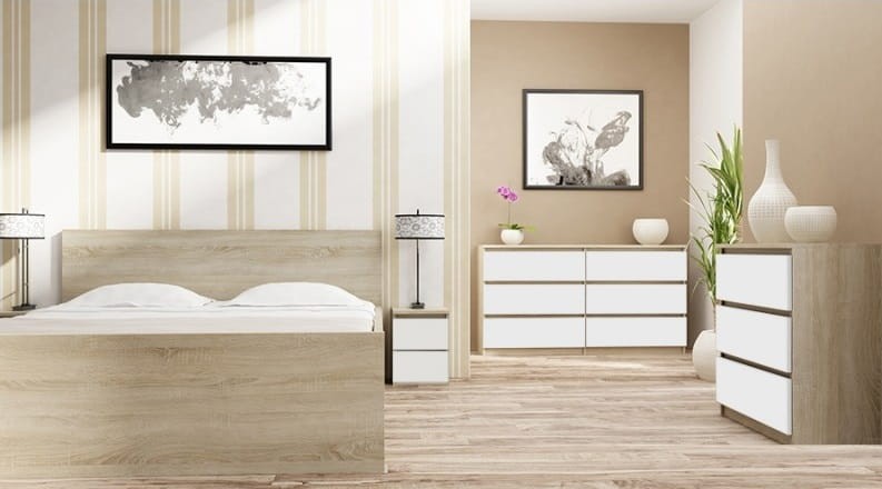 Urządzasz swoją wymarzoną sypialnię i przy łóżku brakuje Ci już tylko szafki, na której będziesz mógł wieczorem odłożyć czytaną aktualnie książkę? Doskonale w tej roli sprawdzi się nasz stolik nocny Merlin w kolorze dąb sonoma z białymi frontami. Na blacie jest wystarczająco miejsca na lampkę nocną a także telefon czy okulary. Dodatkowo szafka ma dwie pojemne szuflady, w której również pomieszczą się niezbędne drobiazgi.