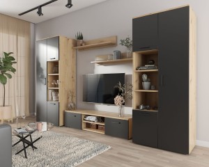 Zestaw mebli Anesto pomoże wprowadzić do wnętrz Twojego domu ład i harmonię. To tutaj spotyka się design z nienagannym wykonaniem i funkcjonalnością. Zestaw mebli Anesto składa się z kombinacji modułowych elementów, które mogą funkcjonować razem, jako meblościanka, a także oddzielnie np. w różnych miejscach klimatycznie urządzonego salonu. Jest to szafka RTV z miejscem na telewizor - może ona tworzyć centralny punkt aranżacji. Taką przestrzeń doskonale uzupełniają dwie pojemne szafy z wieszakami a także półki ścienne, stanowiące przysłowiową "kropkę nad i" tego kompletu!