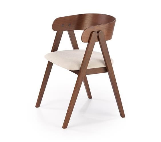 Proste, geometryczne kształty nóg oraz delikatnie łukowate oparcie nadają temu modelowi wyrafinowanego rysu, podkreślając jego wyjątkowy design. Tapicerka w kolorze jasnego beżu harmonijnie komponuje się z orzechowym odcieniem drewna, tworząc subtelny, lecz wyraźny efekt wizualny.