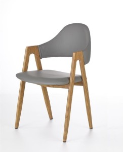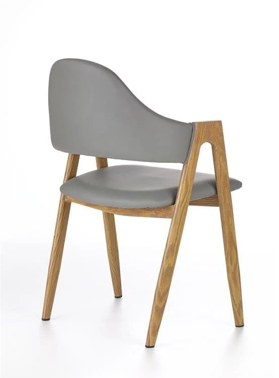 Model ten opiera się na starannie przemyślanych, smukłych, metalowych nogach - pomalowanych na kolor miodowego dębu, odpornych na uszkodzenia mechaniczne i korozję. Ta ciekawa, stabilna konstrukcja zapewnia jednocześnie wygodne podparcie w postaci podłokietników. Dzięki temu krzesło jest wygodne. Na Państwa uwagę zasługuje również siedzisko! Niebanalnie zaprojektowane, z komfortowym oparciem - jest tapicerowane są ultra modną ekoskórą w kolorze szarym. Takie połączenie materiałów, a także solidne wykonanie - gwarantują trwałość mebla oraz długiego użytkowania! Ponadto łatwo jest utrzymać takie krzesła w czystości. Świetnie wyglądają w zestawie! Taki komplet krzeseł prezentuje się oszałamiająco!