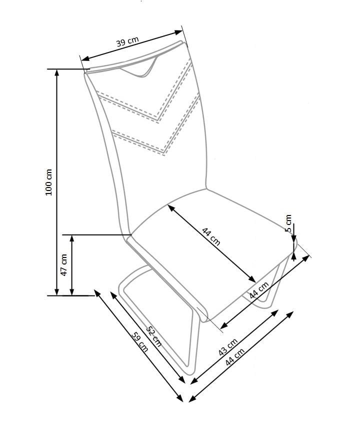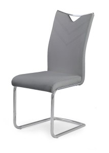Pięknie zaprojektowane siedzisko, z subtelnymi, geometrycznymi przeszyciami na oparciu, a także jego pomysłowe wykończenie u szczytu sprawiają, że tapicerowane krzesło cechuje się także elegancką formą! Metalowy uchwyt w górnej części oparcia pozwala na łatwe przenoszenie czy też przesuwanie mebla. W dodatku krzesło pokryte jest oddychającą, łatwą w czyszczeniu ekoskórą w kolorze szarym. Odcień ten sprawi, że pomieszczenie wyposażone w krzesła na płozach Haga będzie stylowo urządzone.