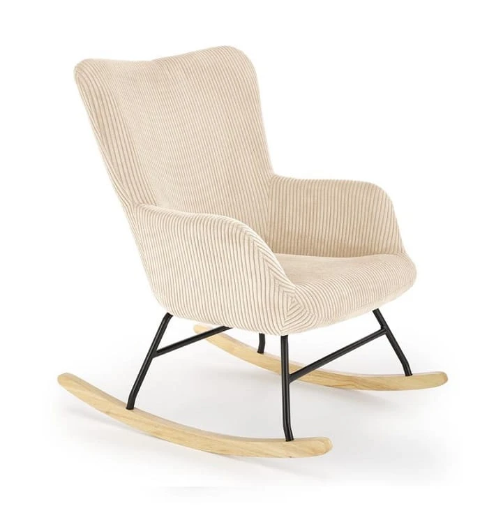 Czarny stelaż i drewniane bieguny w naturalnym kolorze nadają temu fotelowi bujanemu niepowtarzalny, nowoczesny wygląd. Kombinacja beżowego koloru i klasycznego sztruksu sprawia, że jest to mebel, który nie tylko wzbogaci Twoje wnętrze, ale także przyciągnie spojrzenia gości.