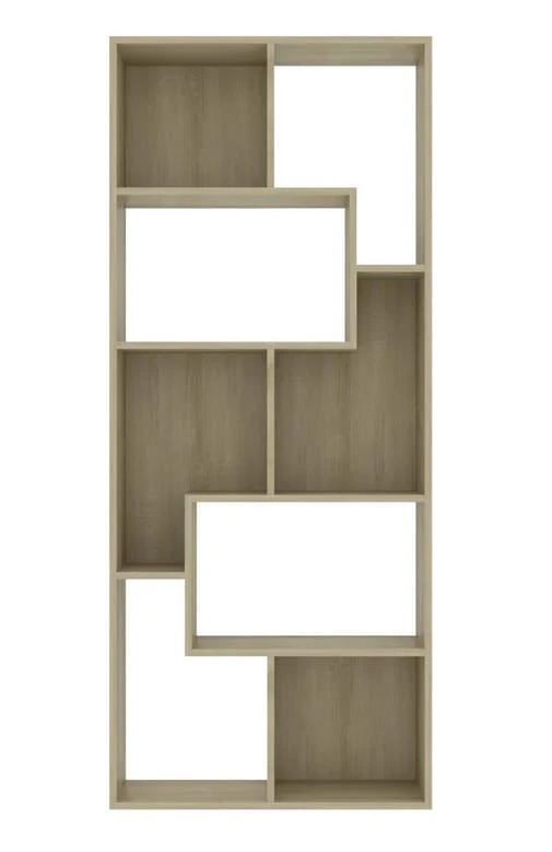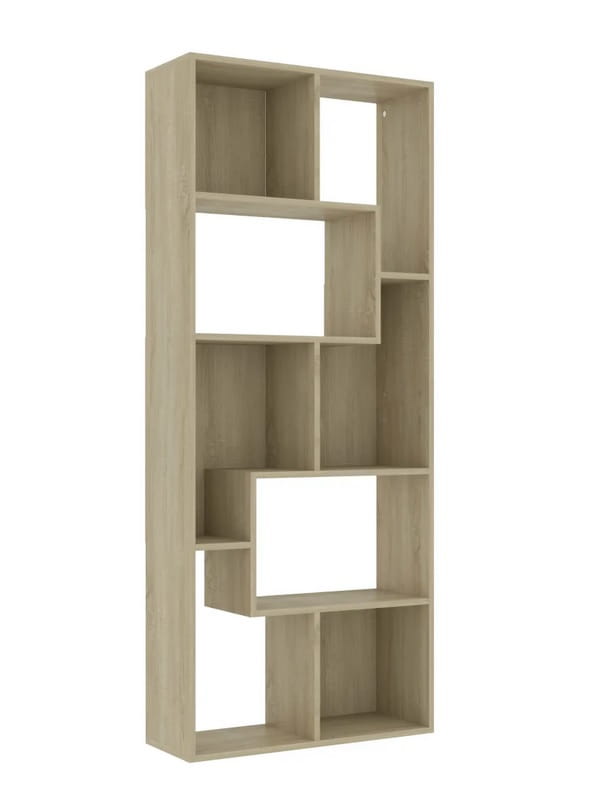 A to za sprawą interesująco zaprojektowanych półek. Ten wysoki na 161 cm regał na książki, zdjęcia, pamiątki i inne drobiazgi, które dzięki licznym półkom znajdą swoje miejsce - ma przemyślany, fantastyczny design. Z pozoru prosty, wyróżnia się jednak asymetrycznym rozstawem półek, niezwykle ciekawym. Na Państwa uwagę zasługuje faktura tego mebla. Do jego wykonania wykorzystano kultową płytę meblową - w kolorze dąb sonoma. Piękną, a zarazem prostą w utrzymaniu. Do regularnej pielęgnacji wystarczy wilgotna ściereczka.
