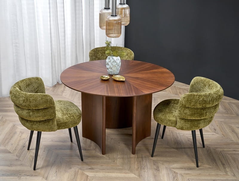 Jednym z największych atutów Calno jest jego uniwersalność stylistyczna - to mebel, który równie dobrze czuje się w klasycznych, tradycyjnych aranżacjach, jak i w nowoczesnych, minimalistycznych przestrzeniach. Okrągła forma i naturalne drewno nawiązują do ponadczasowych rozwiązań, które nie wychodzą z mody, a jednocześnie designerskie nogi i stonowana elegancja kolorystyki sprawiają, że stół nie wygląda na sztywny czy przestarzały. Możesz go zestawić z tapicerowanymi krzesłami w stylu retro, drewnianymi krzesłami w skandynawskim klimacie, a nawet z nowoczesnymi, metalowymi siedziskami - Calno dostosuje się do Twojej wizji i będzie wyglądał, jakby był zaprojektowany specjalnie do tego wnętrza.