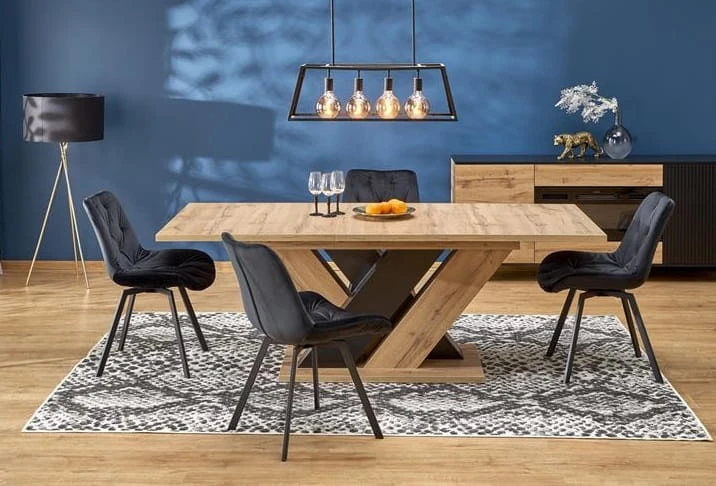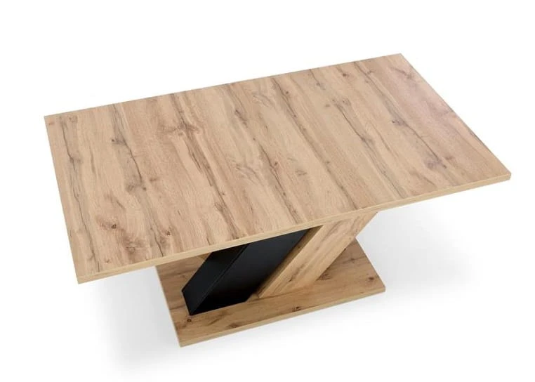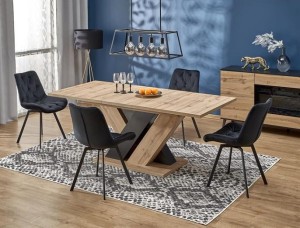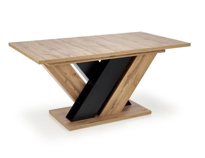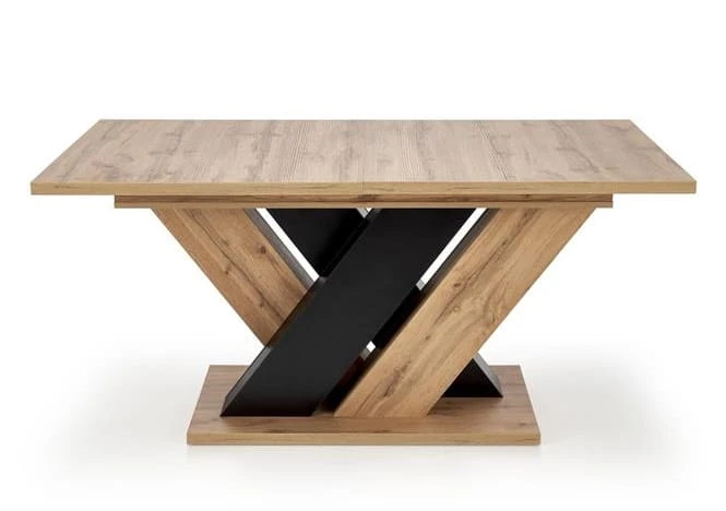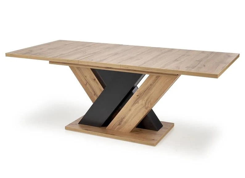 Zalety praktyczne tego modelu są niezaprzeczalne! Meblowa płyta laminowana zapewnia niesamowitą wytrzymałość i łatwość w utrzymaniu mebla w czystości, zapewniając swobodę w codziennym użytkowaniu. Czy to pracując przy stole, spożywając posiłki czy podejmując rozmaite aktywności - unikną Państwo obaw o uszkodzenia powierzchni. Opcja rozkładania pozwala na dopasowanie stołu do indywidualnych potrzeb oraz ilości osób. Stół zapewni miejsce dla 6-10 użytkowników. Niezwykły układ nóg, które są wykonane w dwóch rodzajach wybarwień – dąb wotan i czarny – doda aranżowanemu przy pomocy tego stołu wnętrzu niepowtarzalnego charakteru. Będzie on prawdziwą ozdobą pomieszczenia! Dodatkowo, ciekawa konstrukcja nóg w formie znaku "x" korzystnie wpływa na stabilność stołu, eliminując ewentualne obawy związane z wstrząsami czy przesuwaniem.