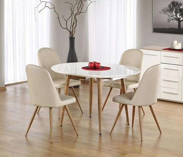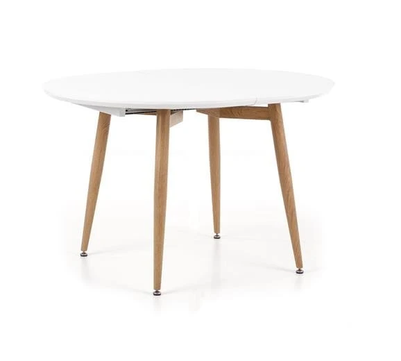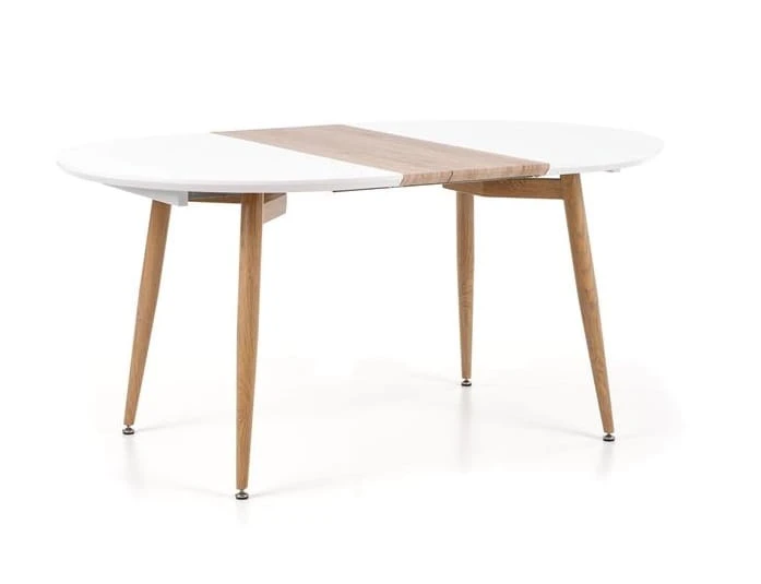 Stół ten ma 100 cm szerokości, 75 cm wysokości i 120 cm długości bazowej. Po jego rozłożeniu blat można jednak wydłużyć aż do 200 cm! A to dzięki dwóm odrębnym elementom, jakimi są specjalne wkładki (przeznaczone do oddzielnego przechowywania). Te jednak, w przypadku większych pomieszczeń mogą być zamontowane w stole na stałe, a mebel, dzięki kompozytom w stylowym w kolorze dąb miodowy zyskuje na atrakcyjności. Połączenie bieli i naturalnego drewna współgra bowiem doskonale.