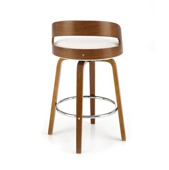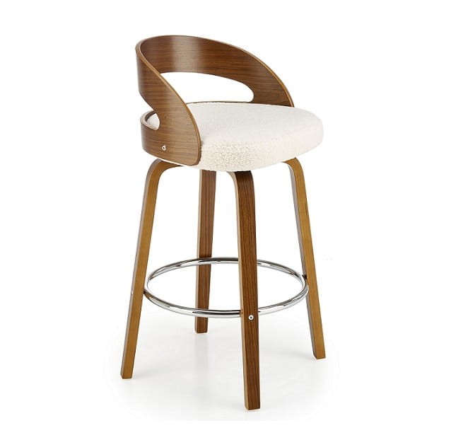 Nie da się nie zauważyć, że jednym z najbardziej charakterystycznych elementów naszego krzesła barowego jest dziurka w oparciu. To udane nawiązanie do historycznego wzorca, które nadaje temu siedzisku specjalnego, wyróżniającego wyglądu. Dzięki tkaninie w stonowanym, kremowym kolorze, krzesło zachowuje jednak subtelną elegancję. Wyróżnia się również wygodą użytkowania. Dodatkowo, stylowe wykończenie stelaża w orzechowym odcieniu fantastycznie harmonizuje z całością projektu.