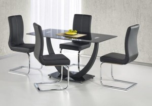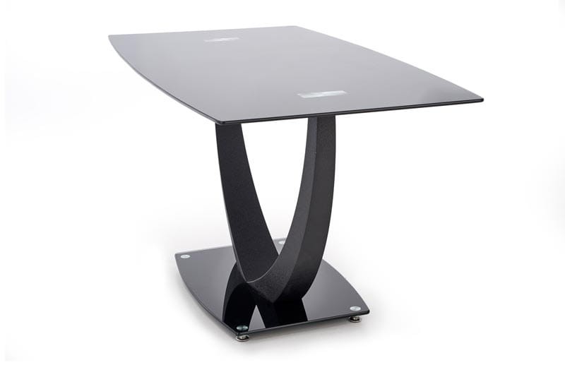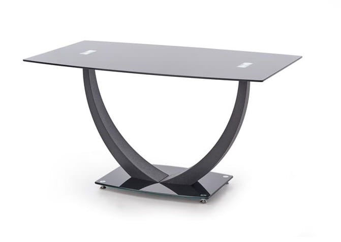 Elegancki stół o silnej formie - silnie determinuje jego charakter. Na uwagę zasługuje stabilny stelaż konstrukcji ze stali malowanej proszkowo, wytworna, nowoczesna forma, a także nieszablonowa kolorystka, gdzie łączy się matowy czarny i szkło. Dodatkowo podstawa stołu wykonana jest ze szkła hartowanego. To sprawia, że świetnie się prezentuje. Jednocześnie łatwo jest utrzymać go w nieskazitelnej czystości.