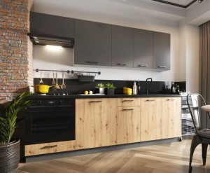 Loftowy zestaw mebli kuchennych Klara wyróżnia się modnym i niepowtarzalnym designem. Fronty szafek stojących są w kolorze dąb artisan, który cieszy się coraz większą popularnością we współczesnych wnętrzach. Ciepły odcień drewna skontrastowany został z ciemnym dekorem grafitu w górnych frontach szafek wiszących. To modernistyczne zestawienie zapewnia nowoczesne, loftowe wnętrze, idealne do spędzania czasu w gronie rodzinnym. Całości dopełnia korpus w kolorze popiel.