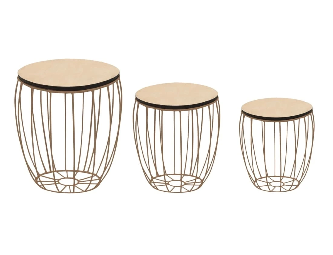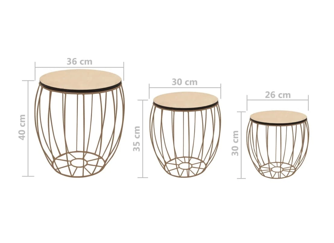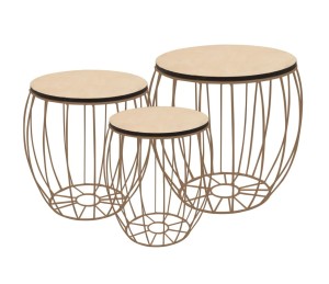 Prezentowany Państwu zestaw Izzy składa się z trzech stolików różnych rozmiarów. I to jedyna cecha, która je różni. Poza wymiarem - prezentują się identycznie. A modele te mają pękaty, beczkowaty kształt podstawy. Ich wizualnie lekka konstrukcja wykonana została z żelaza malowanego proszkowo w kolorze miedzianym. Każdy ze stolików wieńczy okrągły blat z wytrzymałej, komfortowej w użytkowaniu sklejki w naturalnym, drewnianym wybarwieniu.