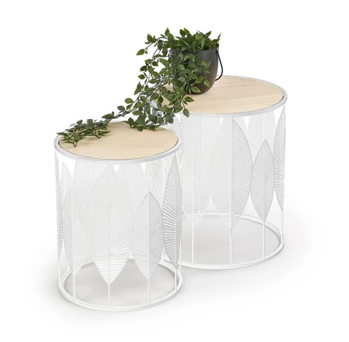Ponadto - świetnie, nieszablonowo się prezentują. Te dwie ławy niewielkich rozmiarów urozmaicą dosłownie każde wnętrze! Szczególnie, że wyróżnia je interesujące wzornictwo oparte na zdobieniach. Każdy stolik, mniejszy i większy, ma identyczną, metalową konstrukcję, w której motywem przewodnim są liście. Elementy florystyczne doskonale wpisują się w przestrzenie urządzane w hołdzie dla natury. Tym bardziej komponują się tu też blaty stolików z płyty MDF, w kolorze naturalnego drewna. Korespondujące z minimalizmem, industrialem i stylem scandi, gdzie liczy się także ich okrągły, geometryczny kształt.