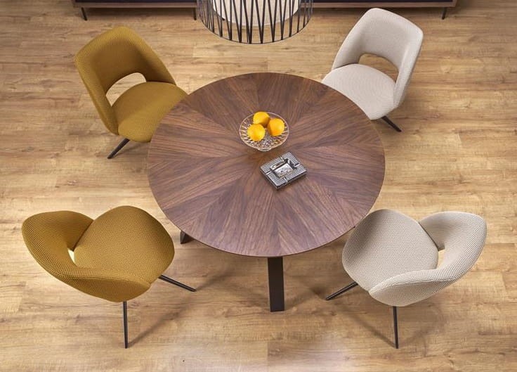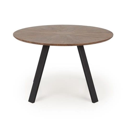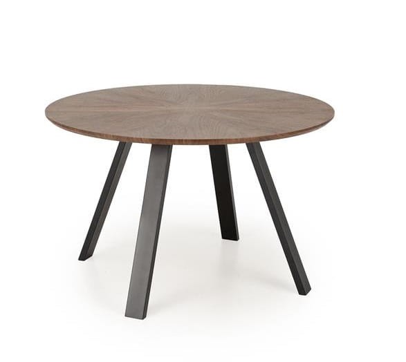 Okrągły blat o średnicy aż 120 cm został wykonany z wysokiej jakości płyty MDF z naturalną okleiną w kolorze orzechowym, która zachwyca pięknym wzorem i ciepłą barwą. Ten elegancki element doda uroku każdemu wnętrzu, tworząc przytulną i jednocześnie wyrafinowaną atmosferę. Malowane proszkowo nogi ze stali nadają stołowi Messo nowoczesny i industrialny charakter. Kontrast między ciemnymi nogami a drewnianym blatem podkreśla nowoczesny design, który wpasuje się zarówno w styl loftowy, jak i nowoczesny.