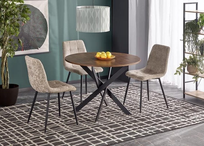 Kontrapunktem dla eleganckiego blatu są surowe, metalowe nogi w głębokiej czerni, których designersko krzyżująca się konstrukcja nadaje stołowi Garde jego niepowtarzalny, industrialny charakter. To właśnie ten kontrast materiałów i form - ciepłego, orzechowego blatu i chłodnej czerni metalu - idealnie wpisuje się w najnowsze trendy aranżacji wnętrz. Smukła konstrukcja nóg nie tylko zapewnia stabilność, ale również optycznie powiększa przestrzeń, czyniąc stół idealnym wyborem zarówno do przestronnych loftów, jak i przytulnych kuchni w bloku.