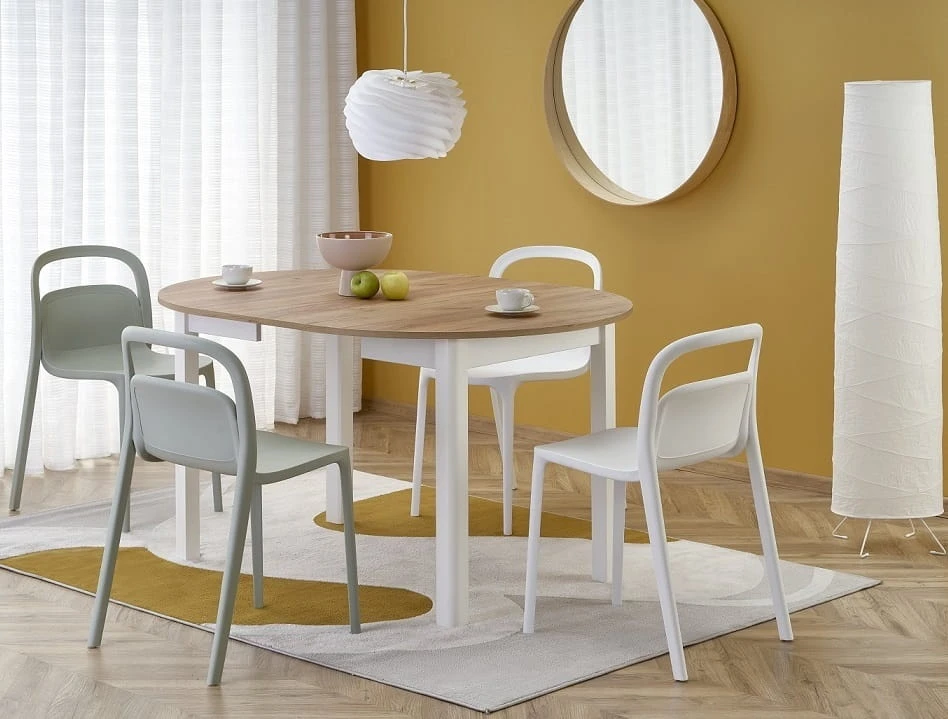 Okrągły stół Harry pozwala zorganizować spotkania dla najbliższych i w miłej atmosferze zjeść posiłek. Dzięki niewielkim gabarytom mebel znakomicie wypełni mniejsze pomieszczenia, tworząc kameralną atmosferę. Rozkładany blat pozwoli dostosować wielkość stołu do potrzeb, powiększając swoją przestrzeń o 40 cm. Większy stół świetnie sprawdzi się podczas przyjęć i na wystawnych kolacjach. Stwórz wymarzoną jadalnie w dowolnym miejscu swojego domu!