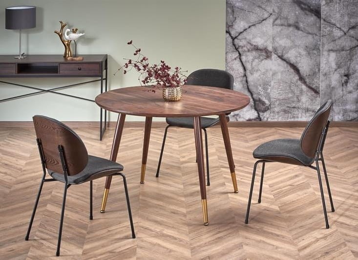 Stół okrągły Faber posiada blat o średnicy 110 cm wykonany z wysokiej jakości płyty MDF okleinowanej w kolorze orzecha. To materiał odporny na uszkodzenia mechaniczne, wilgoć i promienie słoneczne. Blat stołu wsparty jest na czterech zwężających się ku dołowi nogach ze stali pomalowanej na brązowo metodą proszkową. Ich zakończeniem są stopy pomalowane w kolorze złotym. Wszystkie metalowe elementy konstrukcji wspierającej zostały więc doskonale zabezpieczone przed rdzewieniem i urazami mechanicznymi.
