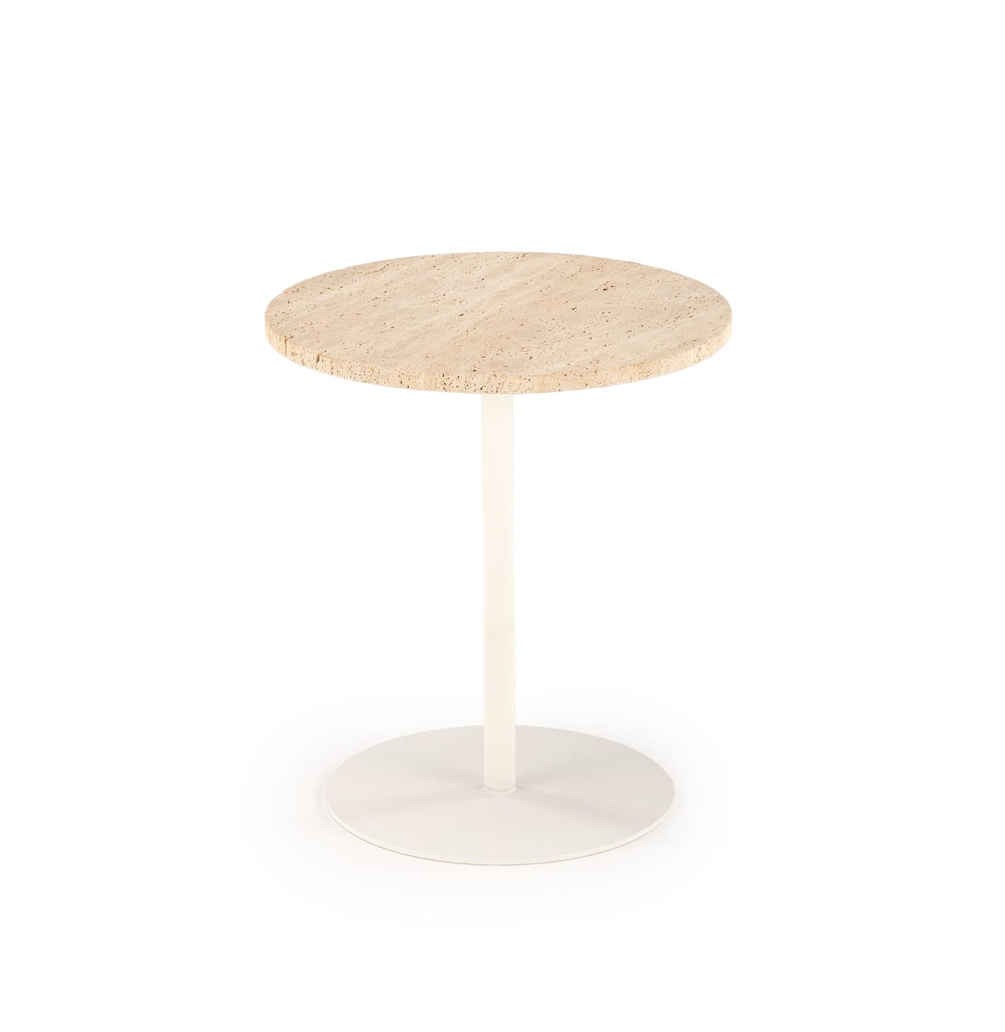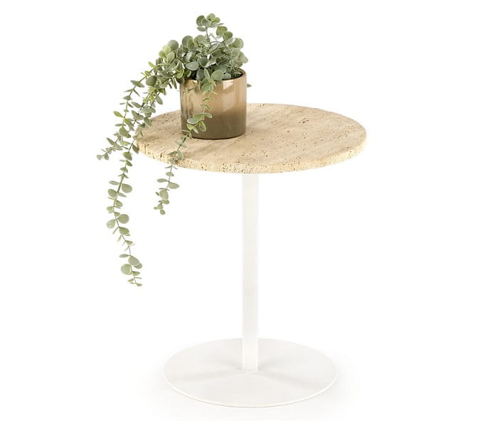 Kamienisty blat z trawertynu to w tym projekcie nie tylko wyraz wyrafinowanego gustu, ale także gwarancja trwałości i odporności na codzienne użytkowanie. Dlatego stolik może funkcjonować jako pomocniczy, do kawy, ale i jako element wystroju służący ustawieniu np. kwietnych dekoracji. Metalowa podstawa na jednej nodze w kolorze białym nadaje formie lekkości i nowoczesności, jednocześnie zapewniając stabilność mebla.